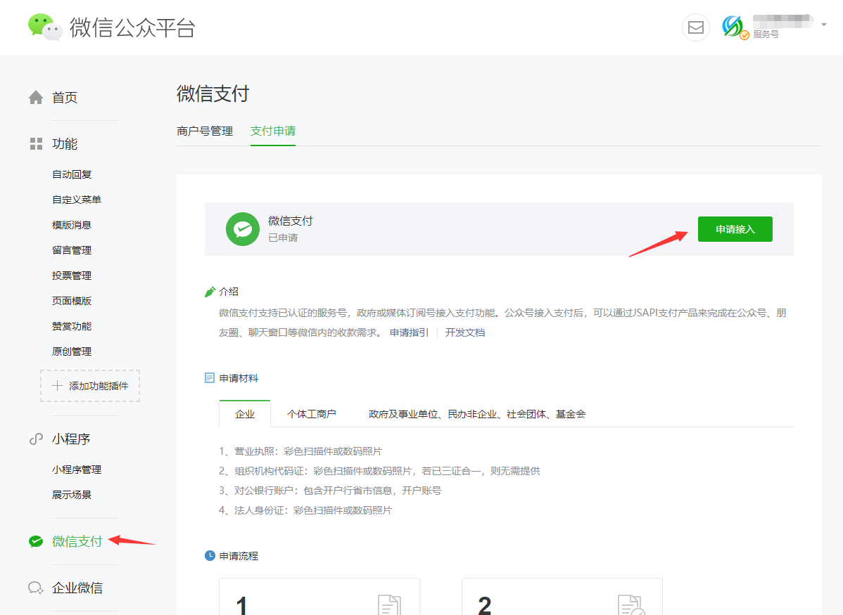 1.申请微信支付接口前先注册一个公众号,类型为服务号,且通过认证,需要有营业执照,公司或者个体工商户均可,网址https://mp.weixin.qq.com/ 2.进入微信公众号平台后,点击左侧的“微信支付”,再点击右侧的“申请接入”,完成申请 3.进入微信公众号平...