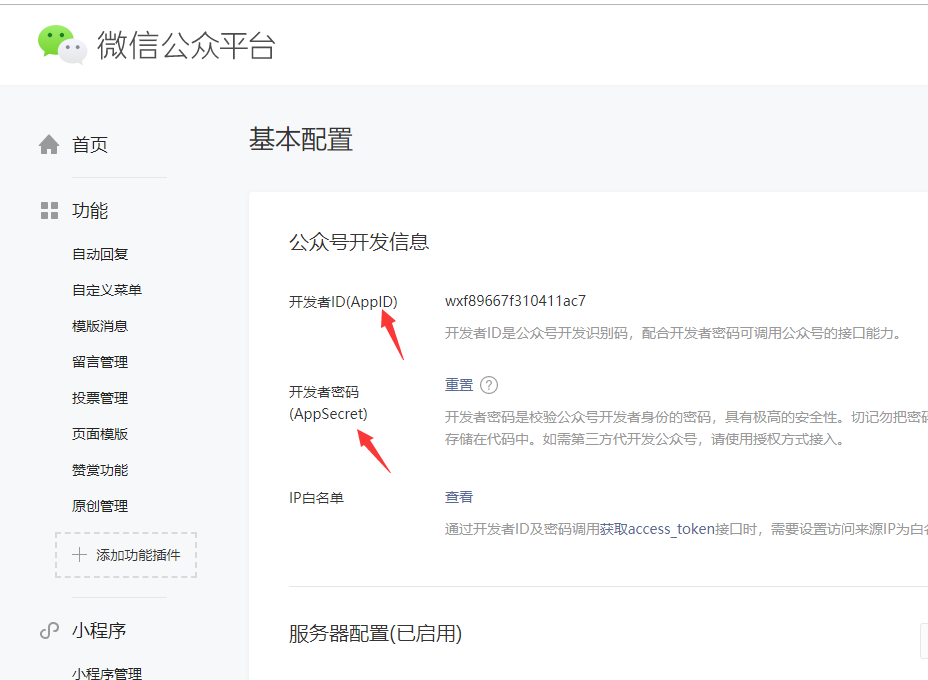 3.进入微信公众号平台后,点击左侧的“开发-基本配置”,即可获取到AppID和AppSecret