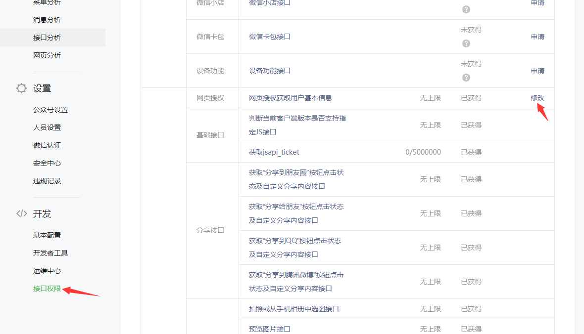 4.点击左侧导航栏的“开发-接口权限”,点击右侧的“网页授权-修改”,改为您自己的域名