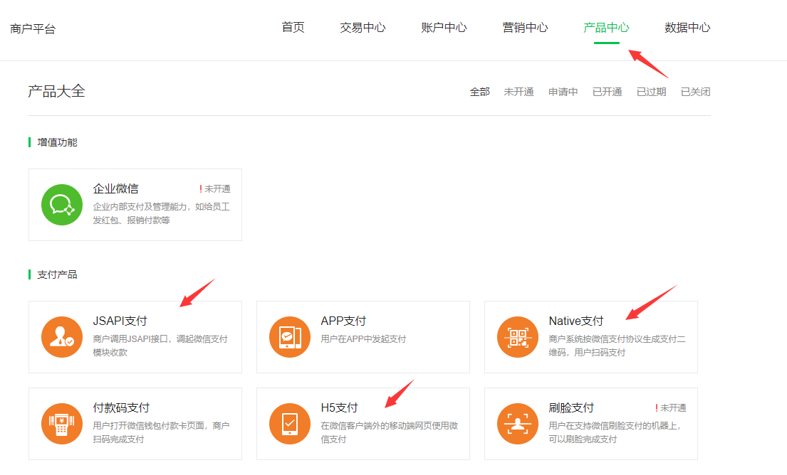 6.点击导航栏的“产品中心”,申请开通JSAPI支付、Native支付、H5支付三个产品