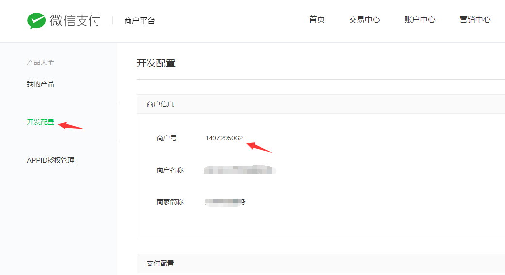 8.点击左侧的“开发配置”,查看到商户号,即微信MCHID