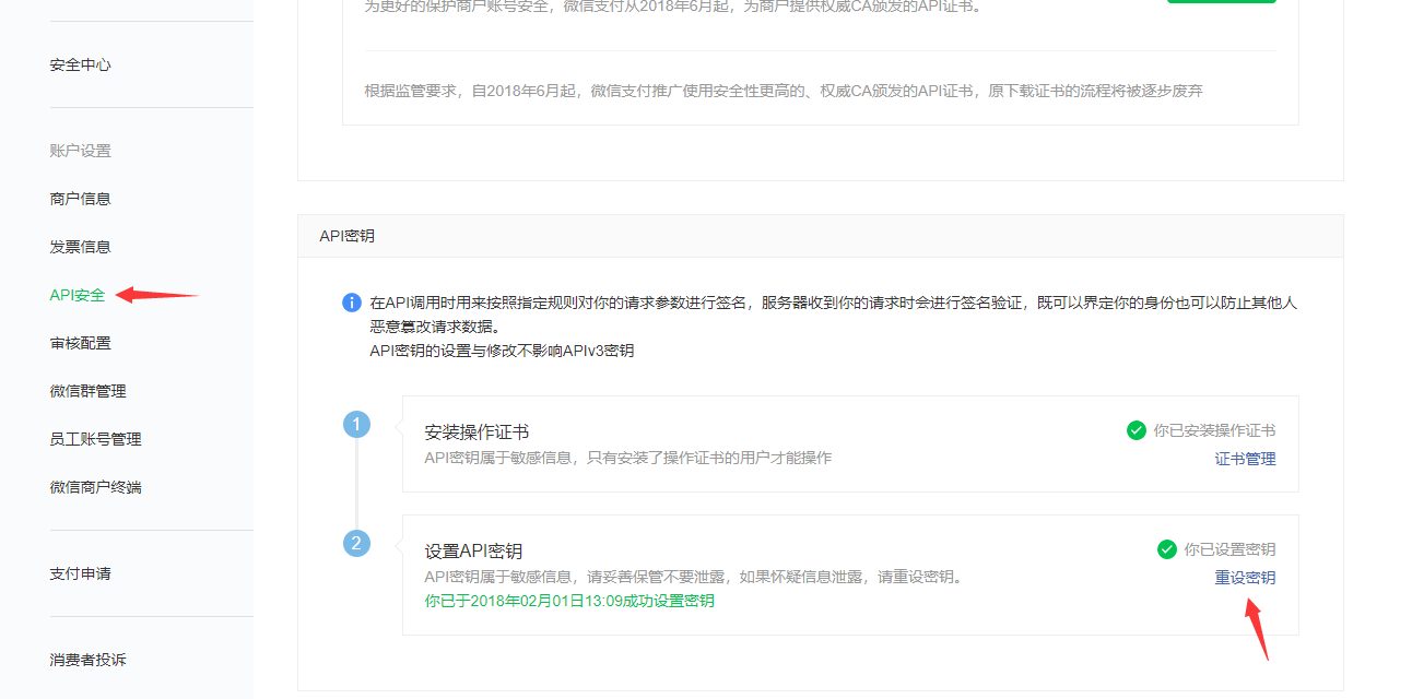 9.点击导航栏的“账户中心”,点击左侧的“API安全”,点击右侧的“重设密钥”,即可获取到微信KEY(v2版本)