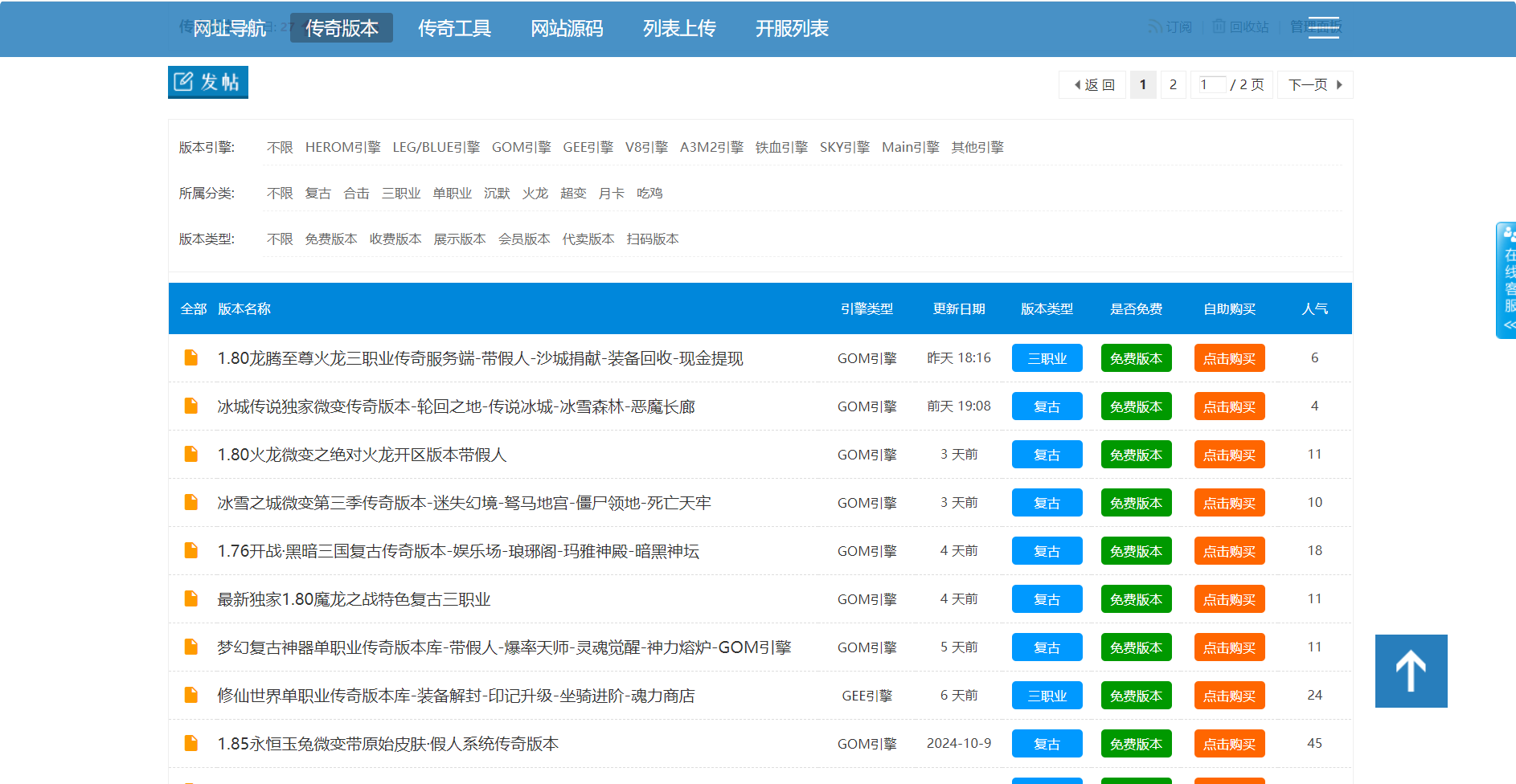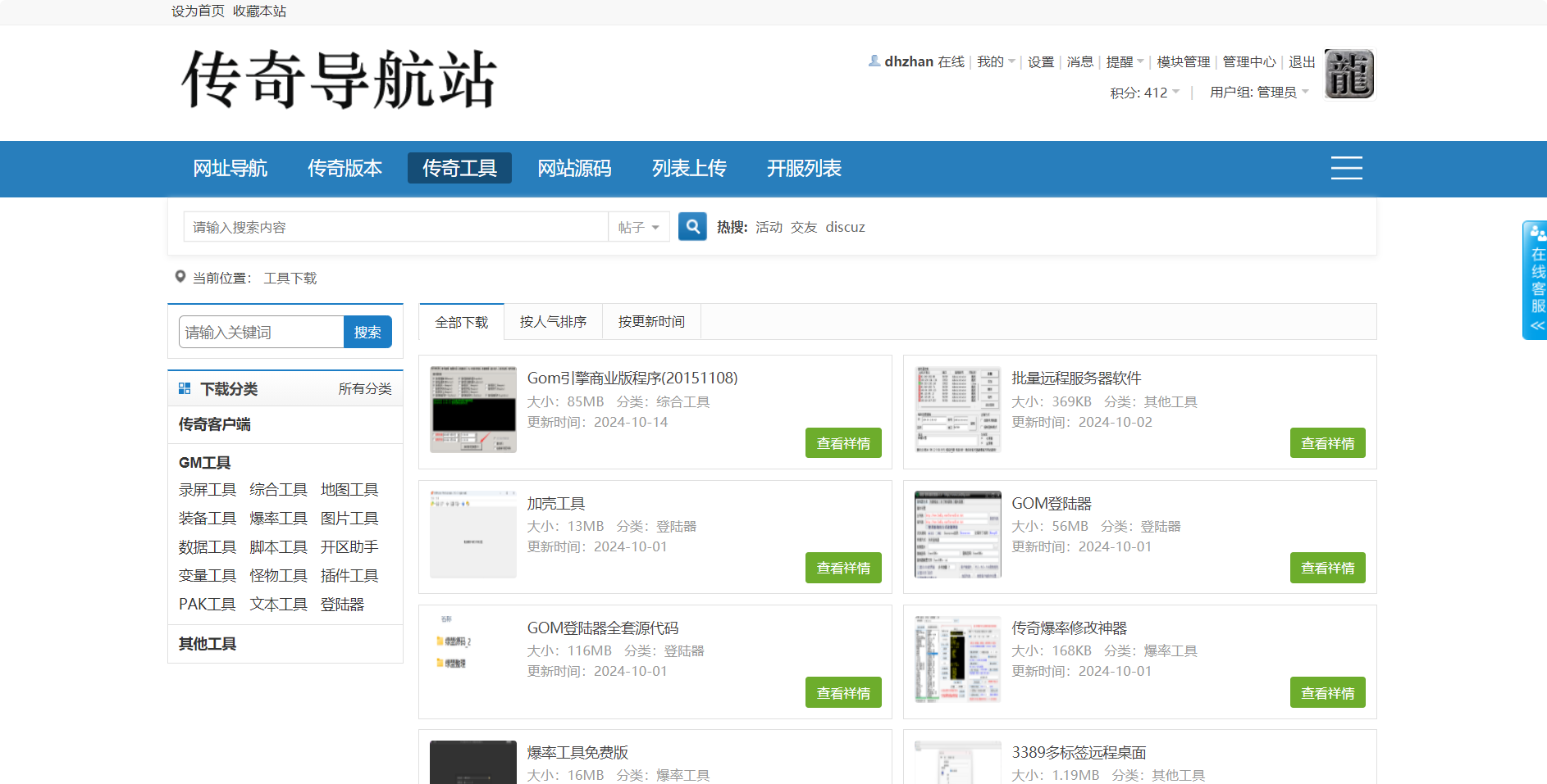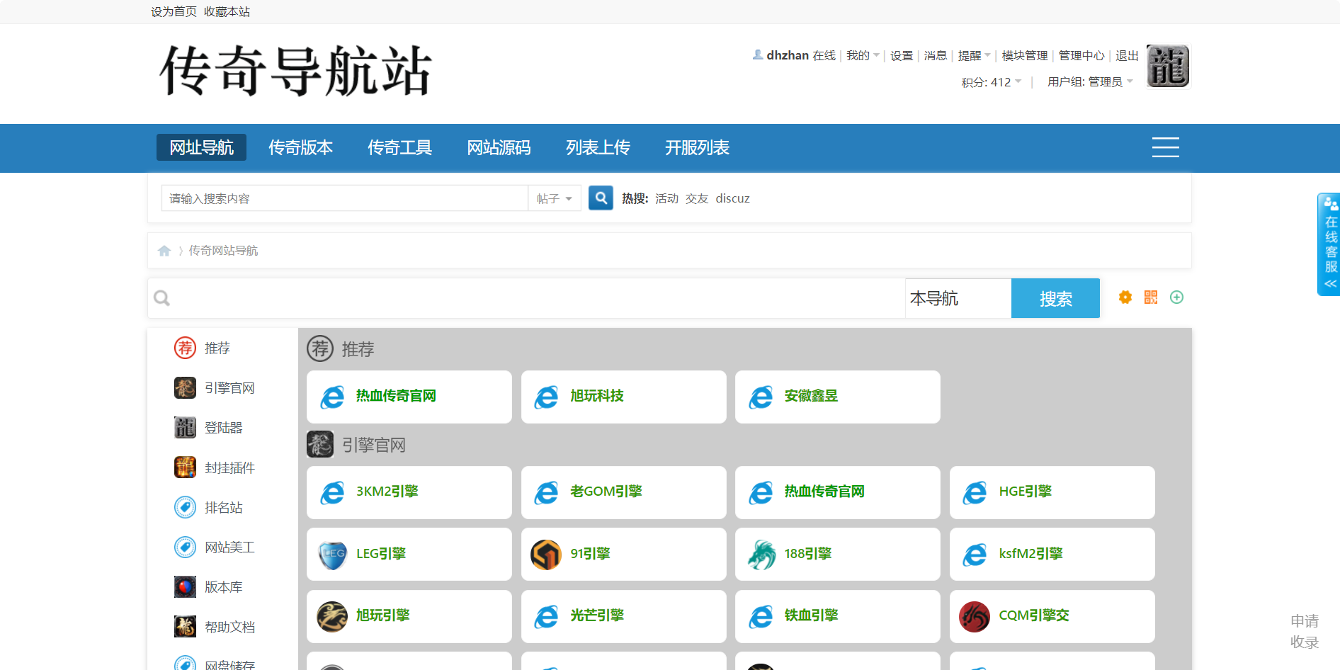 功能:导航,工具下载,版本库,空间列表,开服列表