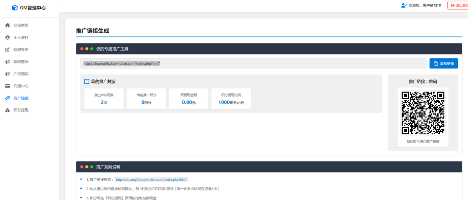 功能2.推广链接:在会员中心可以生成自己的推广链接,每个IP只计数1次,管理员可在后台设置提现比例。
