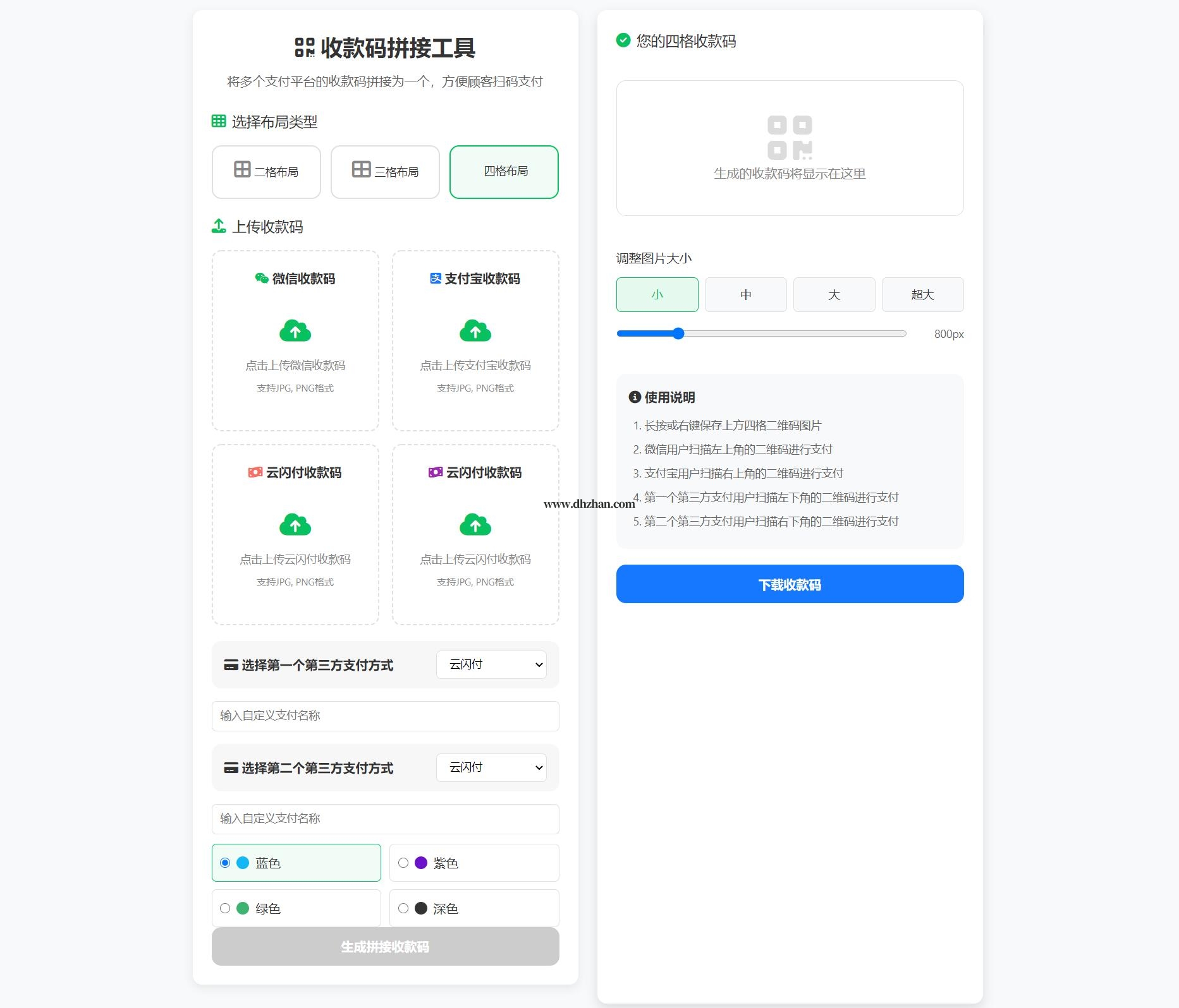 收款码拼接工具合三合一源码,一款支付宝和微信还有云闪付合三为一的工具,非常好用软件是离线版本,双击html文件,用浏览器打开软件。上传相应二维码,然后点生成,在右侧就可拼接出我们需要的二维码。如果你有其他的支付码,也可以使用三格布局或者四格布局。生成后可以调整图片大小,也可以下载到本地。