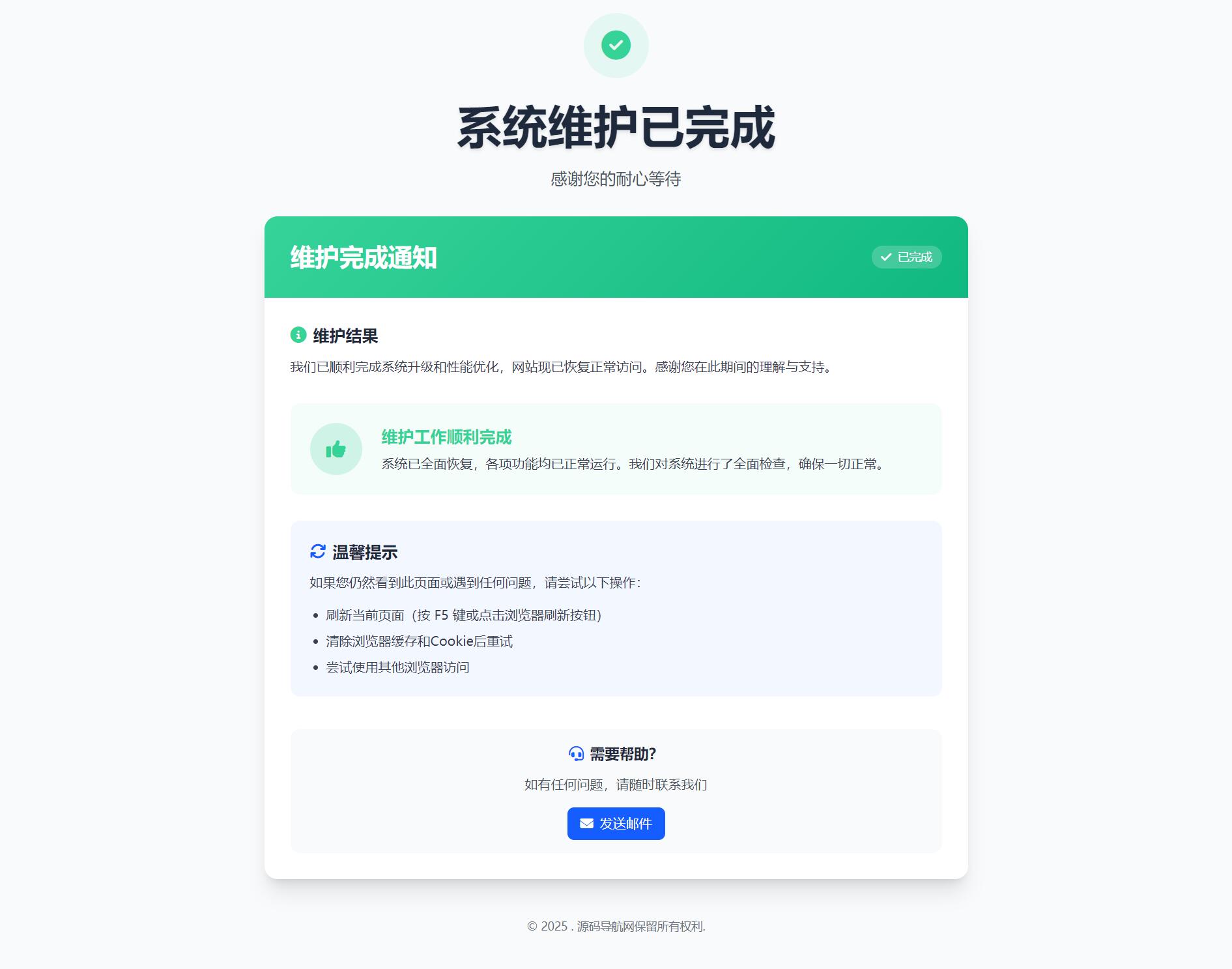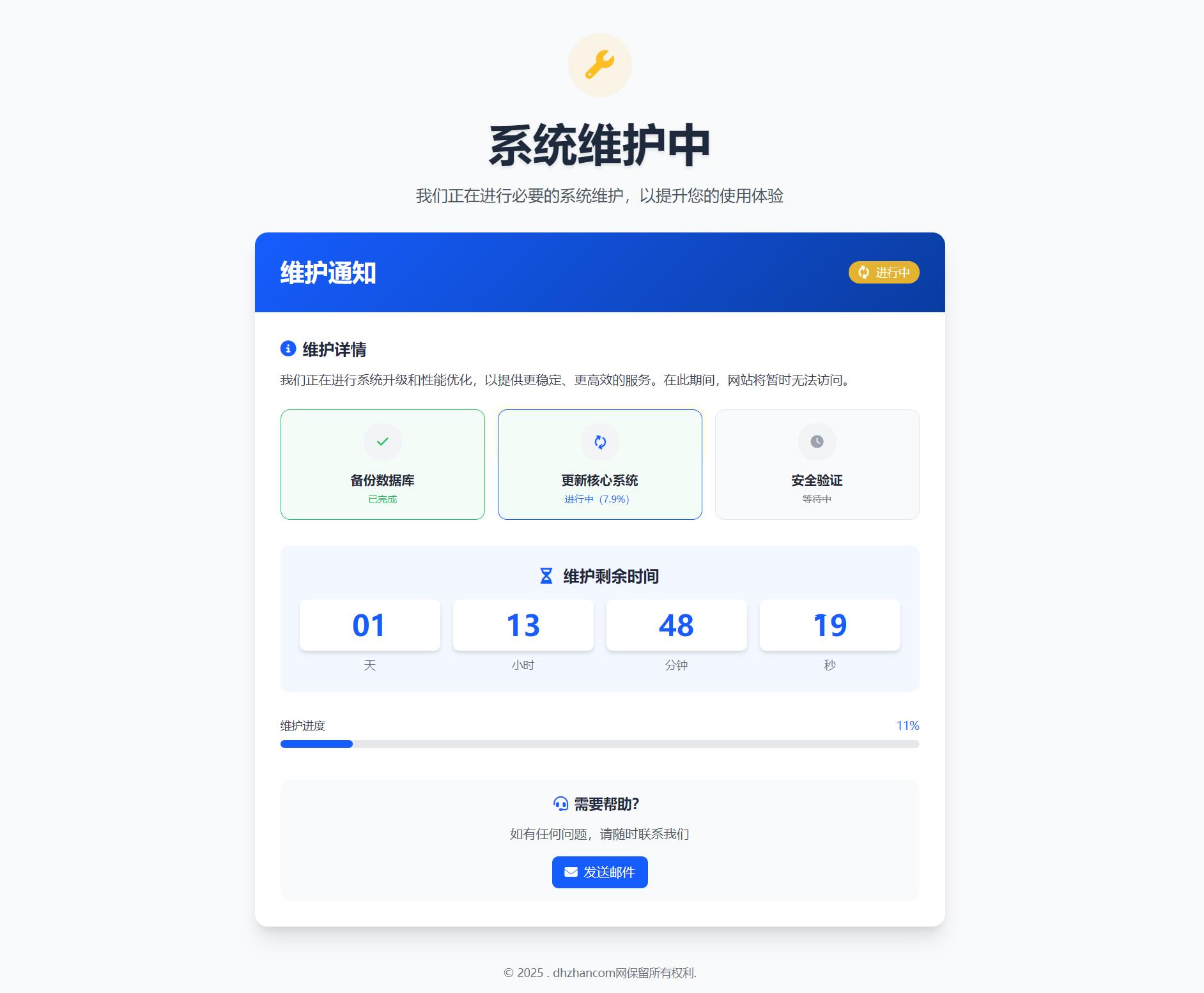 自适应手机和电脑端,页面简洁美观,有三个页面,维护前、维护中、维护完,无后台,内容在首页index文件修改只需要设置好维护开始和结束时间,会自动依次按顺序显示三个页面,倒计时结束后会一直显示维护完成页面