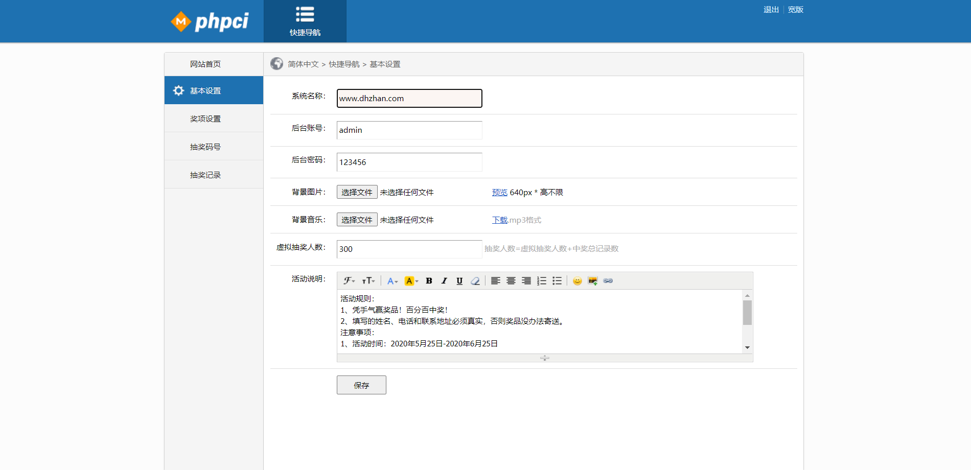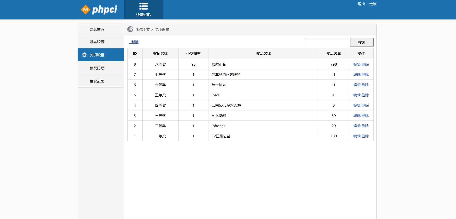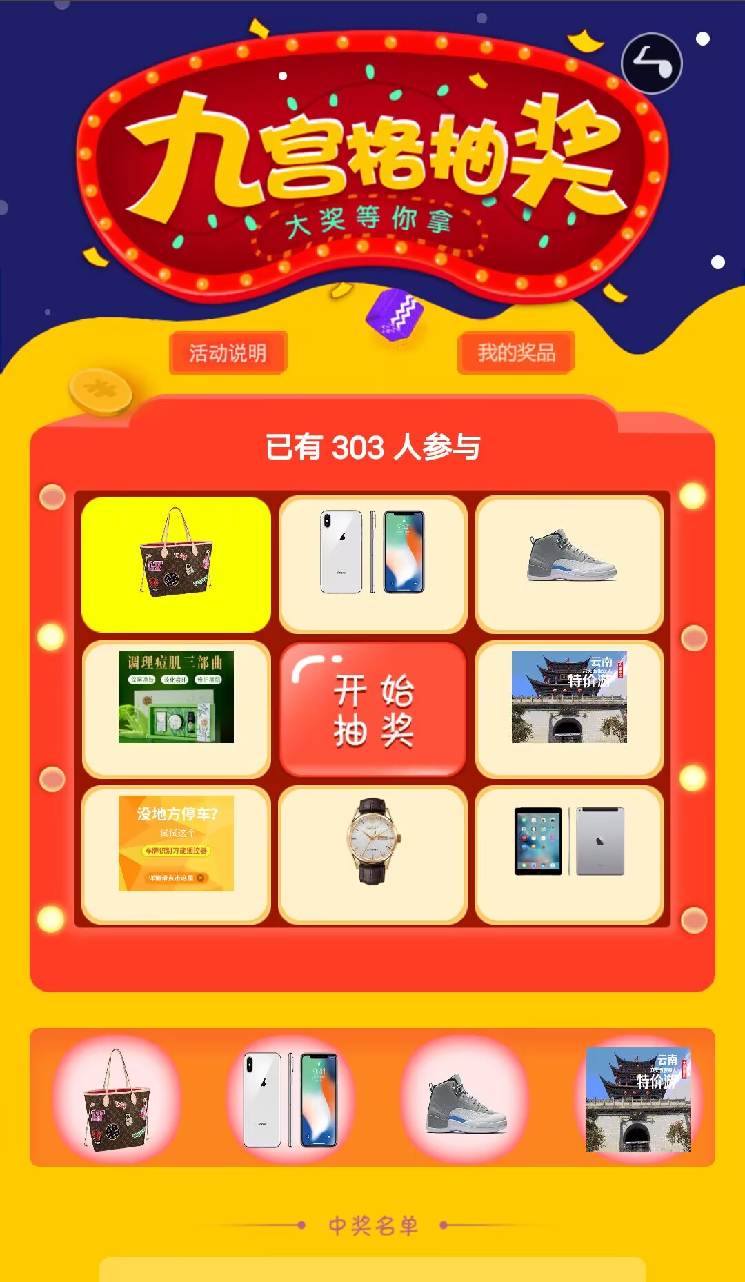 九宫格抽奖系统,后台可以自定义设置抽奖奖品,支持设置概率和数量,数量为0时不会抽中,可以生成抽奖码用于抽奖验证,没有抽奖码是无法抽奖的,抽奖码可以随机或者绑定指定抽奖奖品,功能能完善