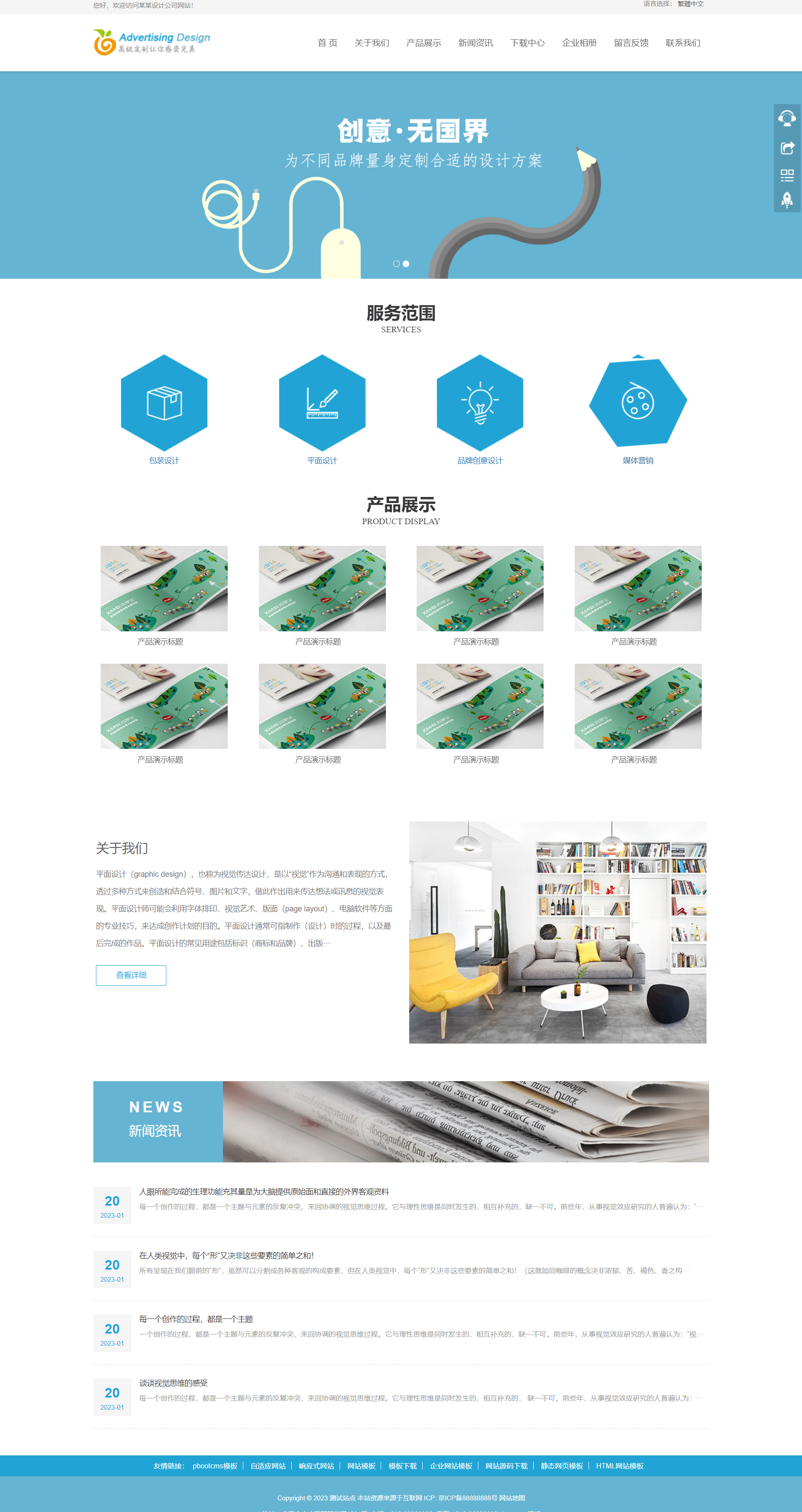 简繁双语品牌创意设计pbootcms网站模板,海报设计VI设计印刷设计网站源码下载