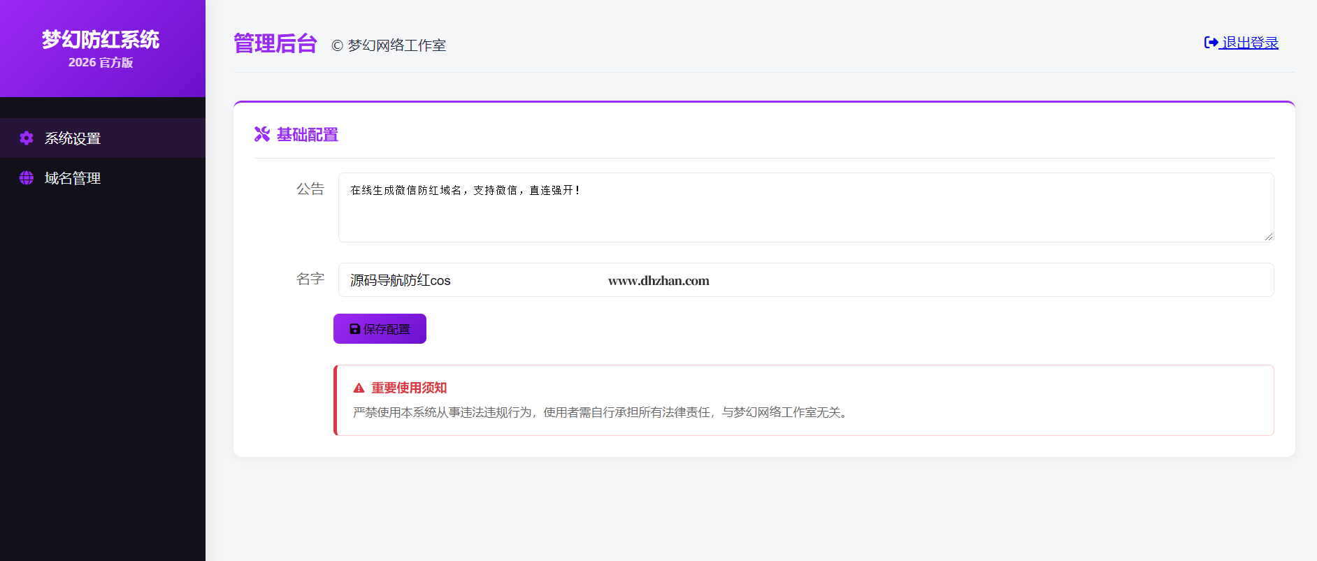 1.增加了多域名生成管理,可以添加多域名生成,会自动随机生成去生成的红域名链接,都是可以打开,不是单页防红,是全套防红2.优化安装页面还有框架布局,php7.2以上即可3.上传源码链接,你的域名/install.php,去安装即可4.留个版权,修改不易5.增加了生成域名自动带检测是否被拦截的状态6.增加个http开头的生成域名的