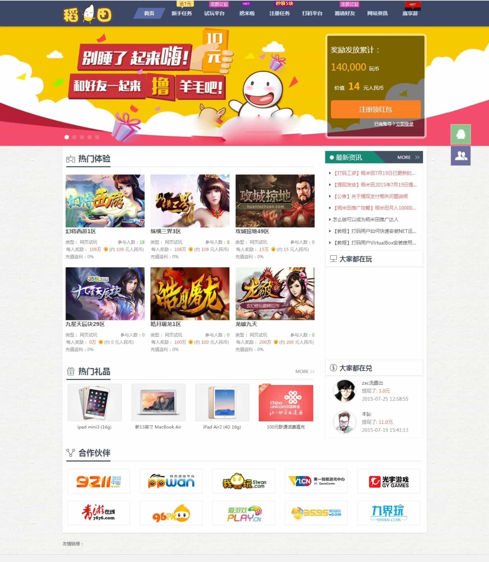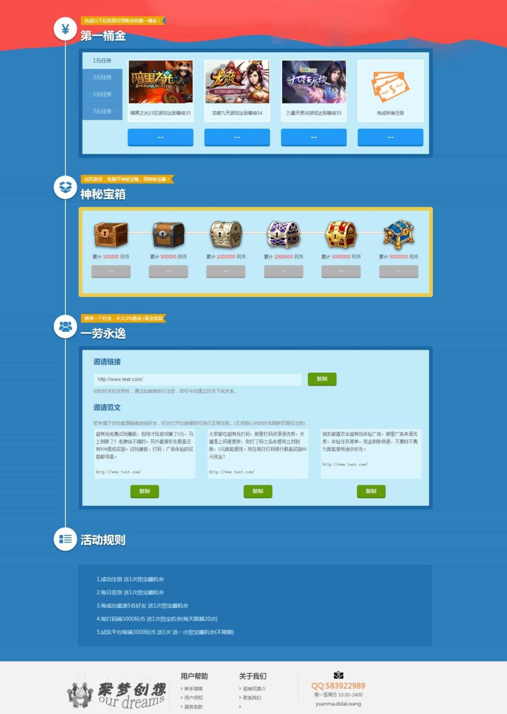 程序带有1.游戏试玩功能2.广告体验功能3.打码功能4.新人任务5.开启宝箱功能