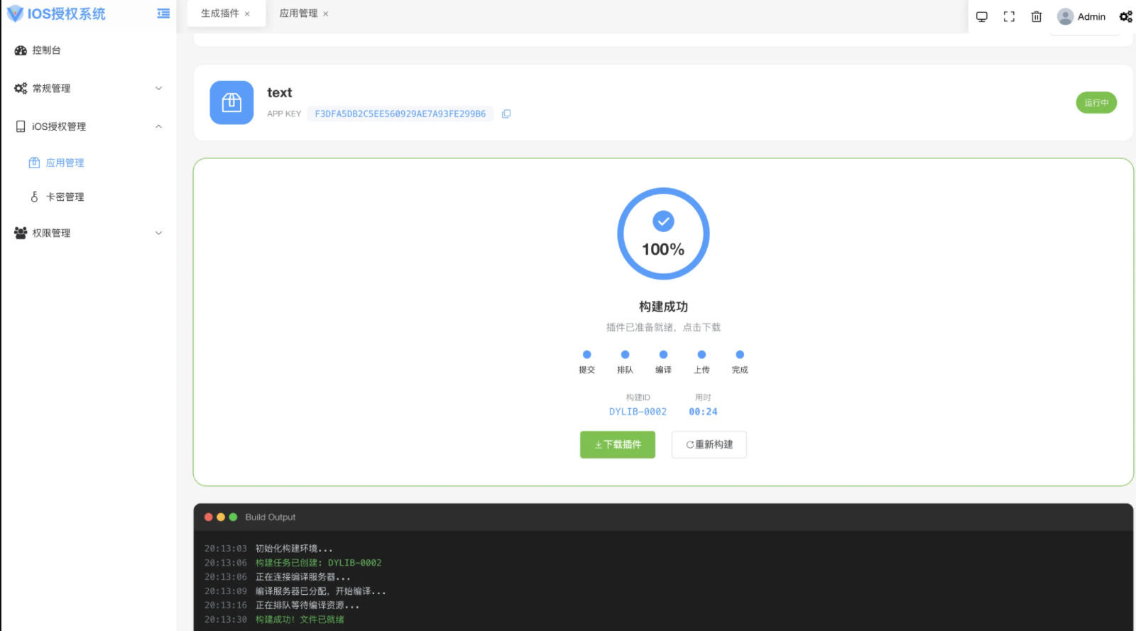 部署到自己服务器,后台管理应用和卡密,一键云端编译生成授权插件,注入到目标 App 即可实现卡密验证功能。