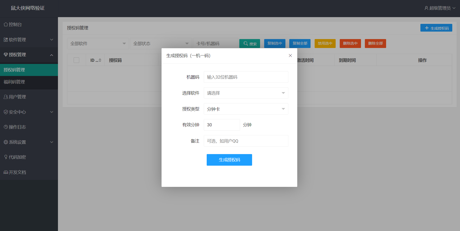 - 授权码(一机一码)- 为指定机器码生成授权