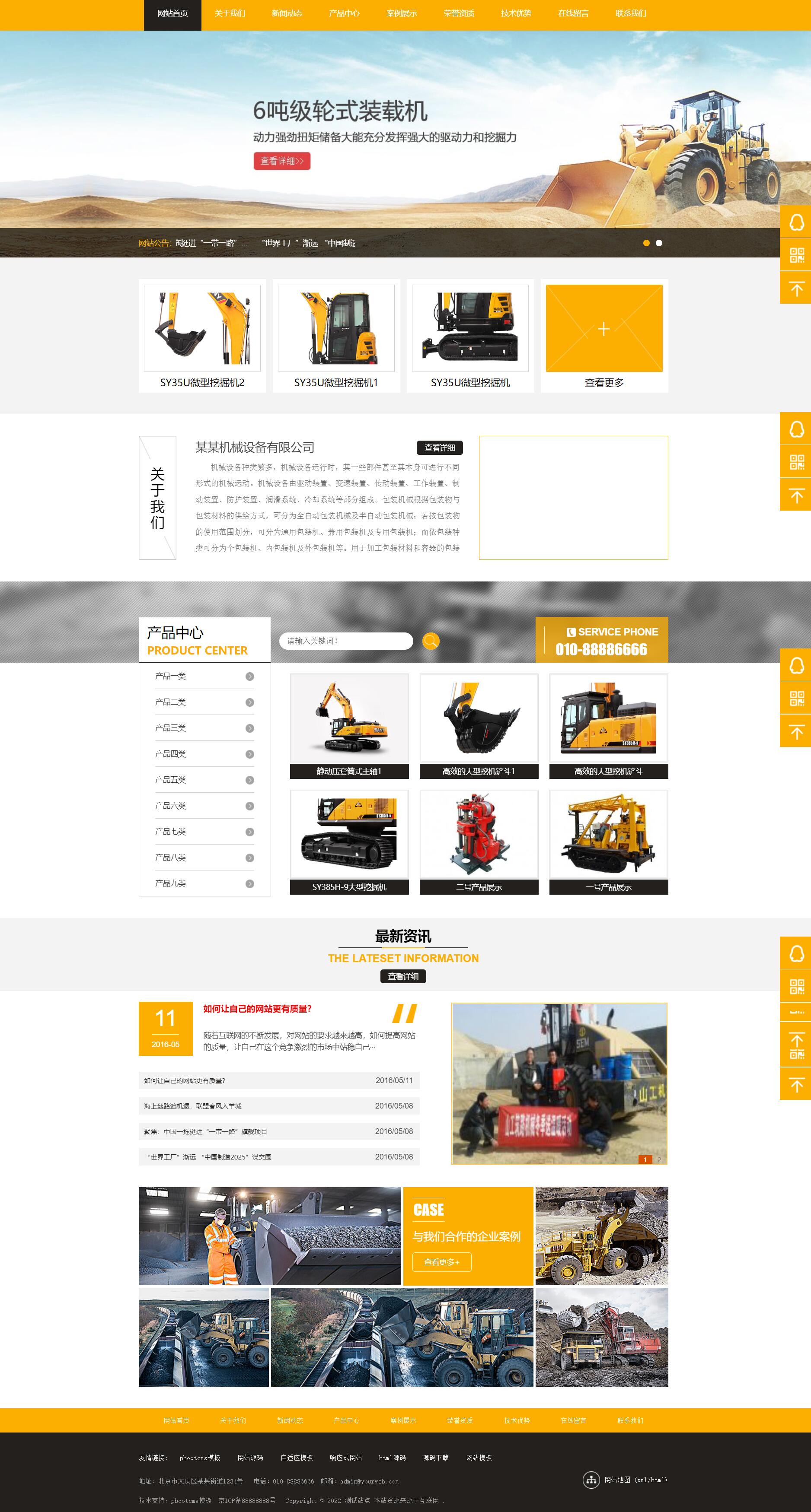 黄色机械设备pbootcms网站模板 挖掘推土机类网站源码下载