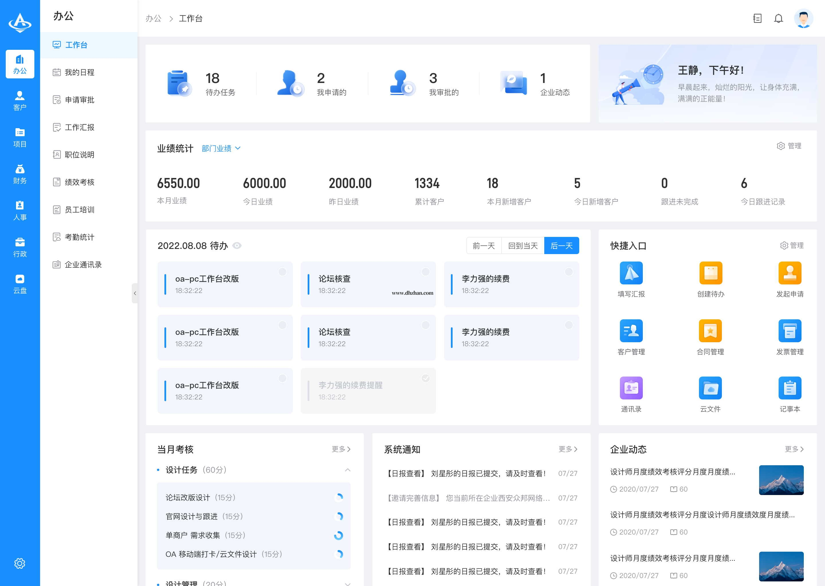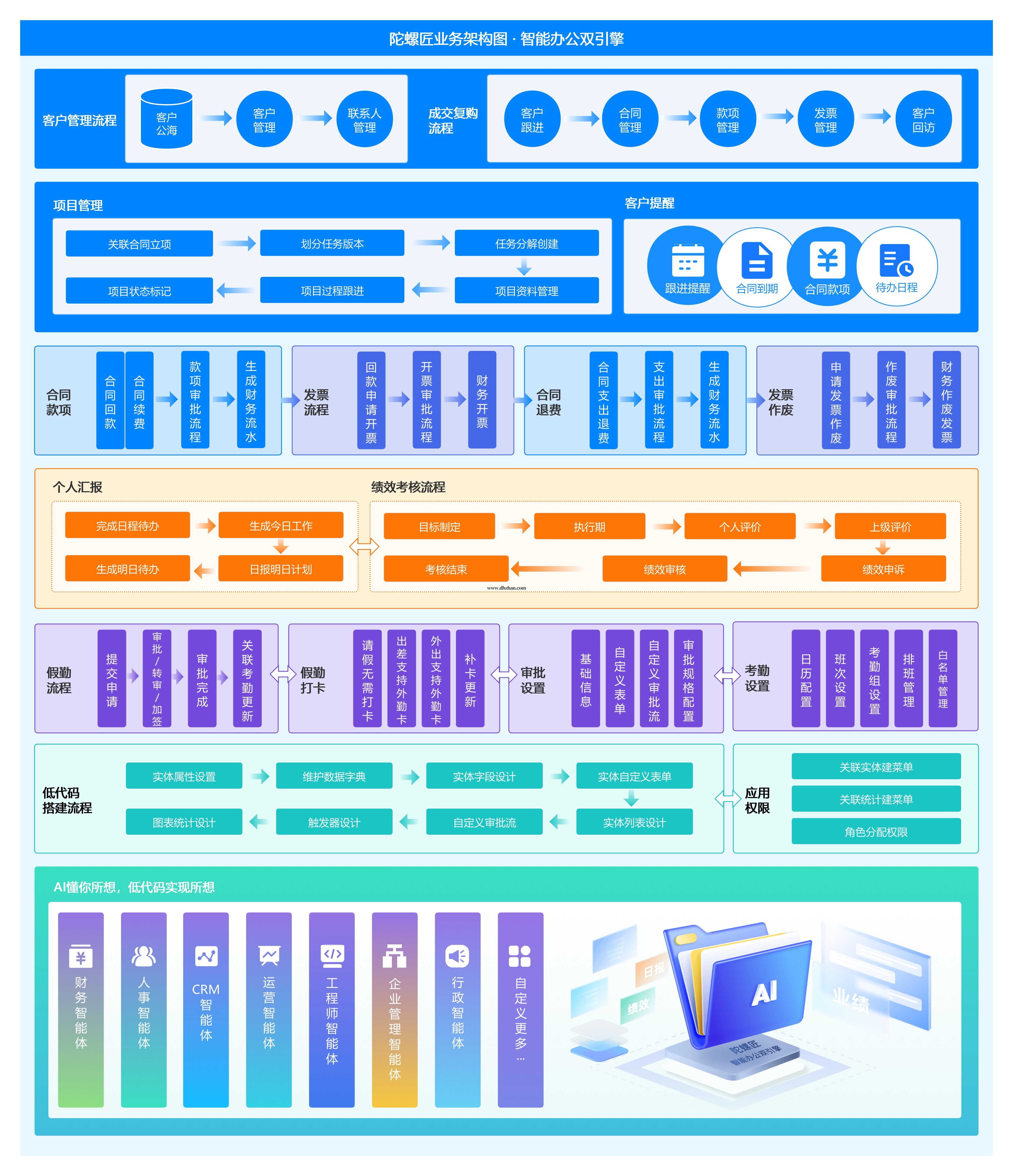 AI、低代码、考勤打卡、审批流、工作汇报、绩效管理、客户管理、合同管理、发票管理、业绩统计、项目管理、财务管理、组织架构、职级管理、岗位职责、企业动态、物资管理、云盘等……