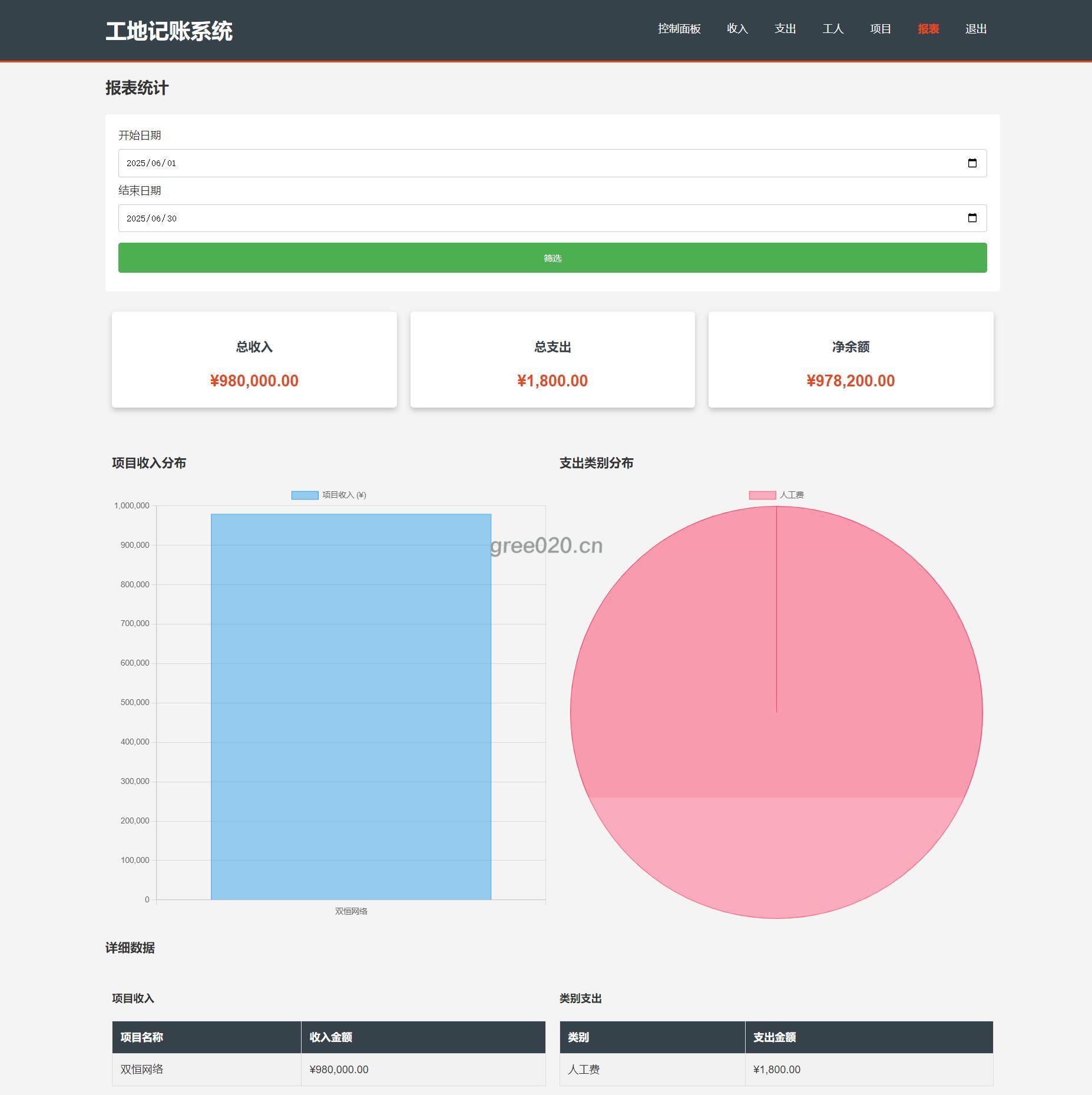 收入/支出双轨记账,精确到分支持项目关联收入(如工程款)支出分类管理(材料/人工/设备等8+类别)实时净收益计算(总收入 – 总支出)工人管理完整工人档案(姓名/电话/身份证/职位)日工资标准记录