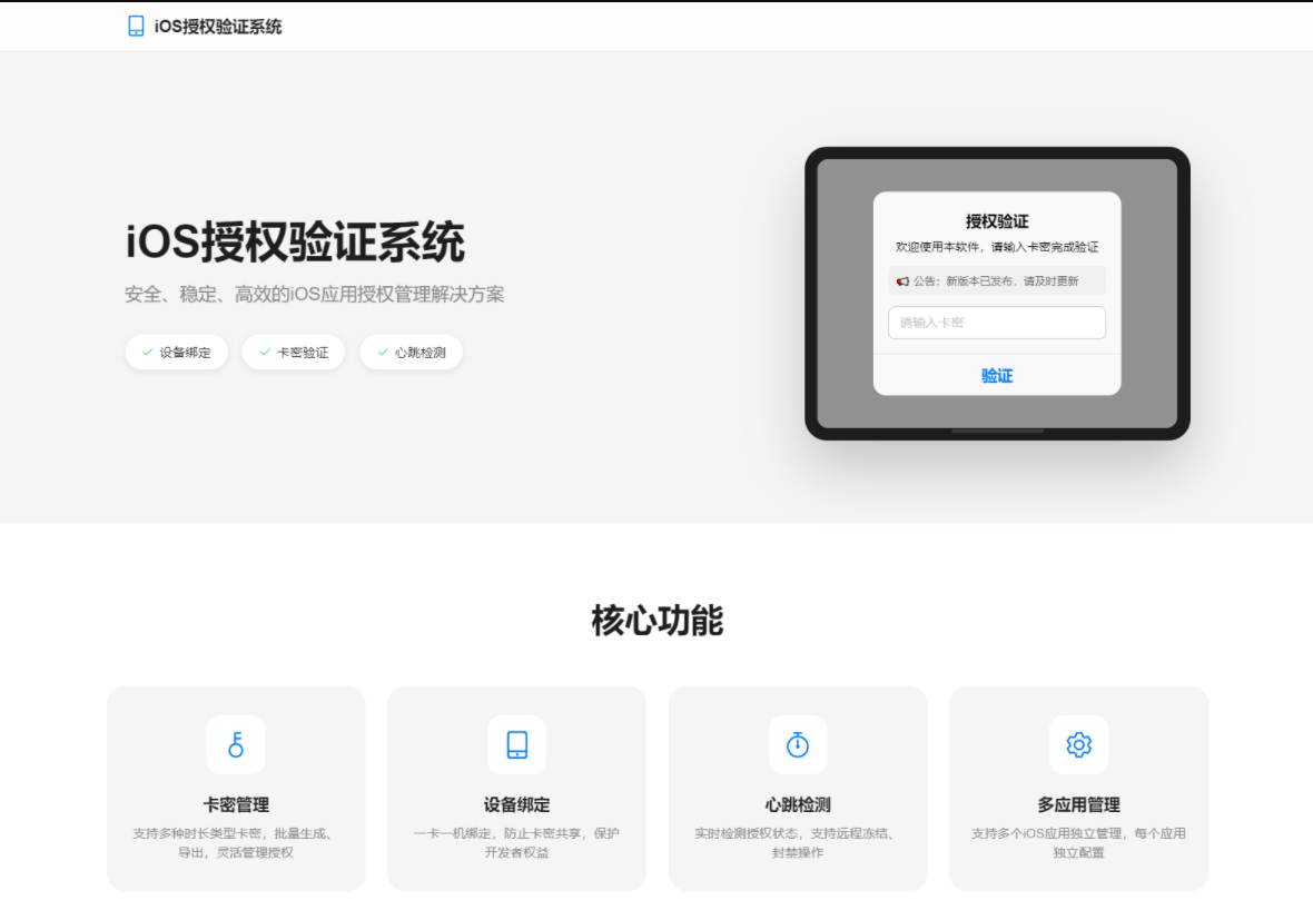 一套完整的 iOS 插件授权验证解决方案,专为 IOS 网络验证开发者打造。