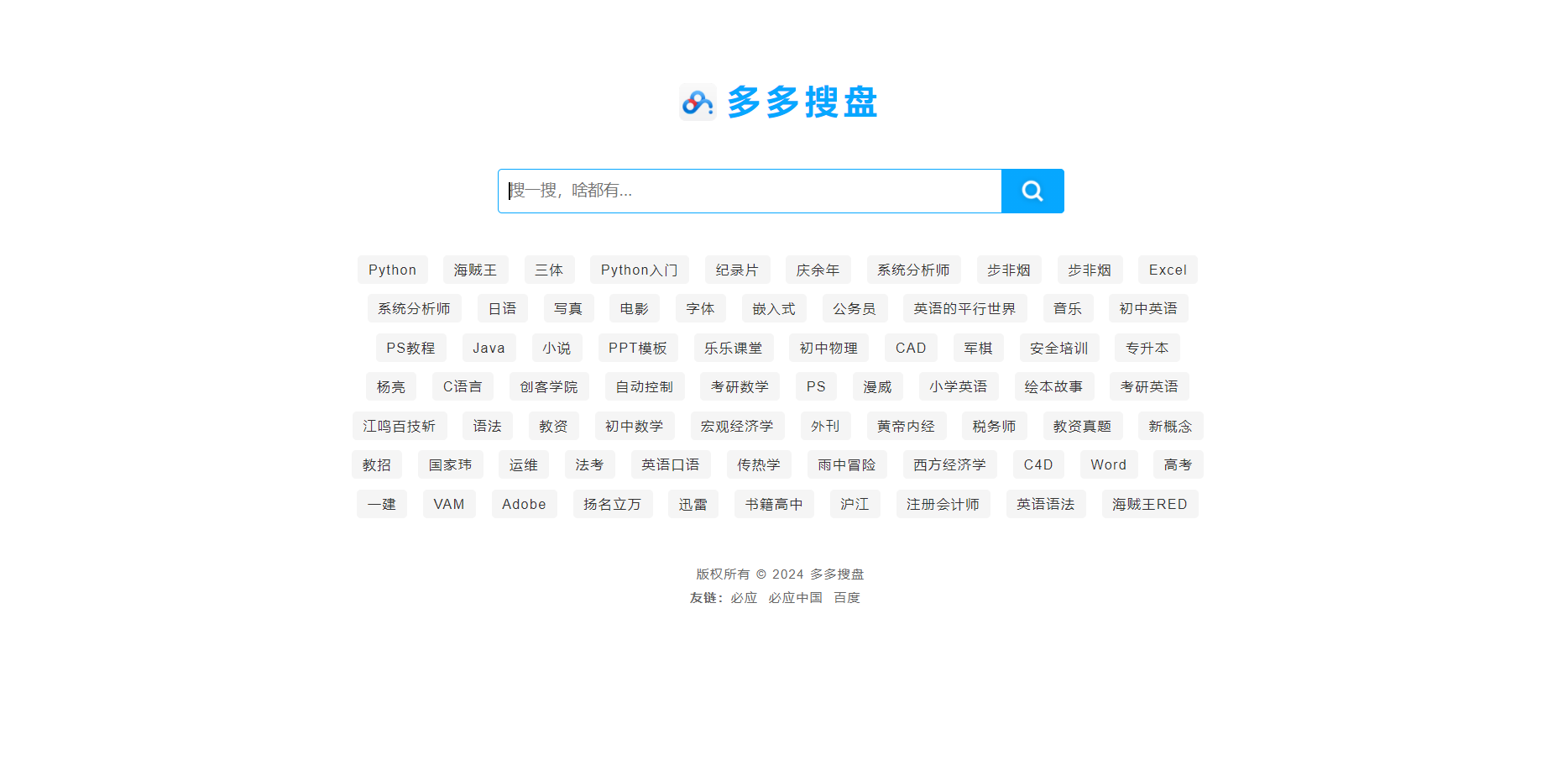 这是一个基于thinkphp5.1+MySQL开发的网盘搜索引擎,可以批量导入各大网盘链接,例如百度网盘、阿里云盘、夸克网盘等。