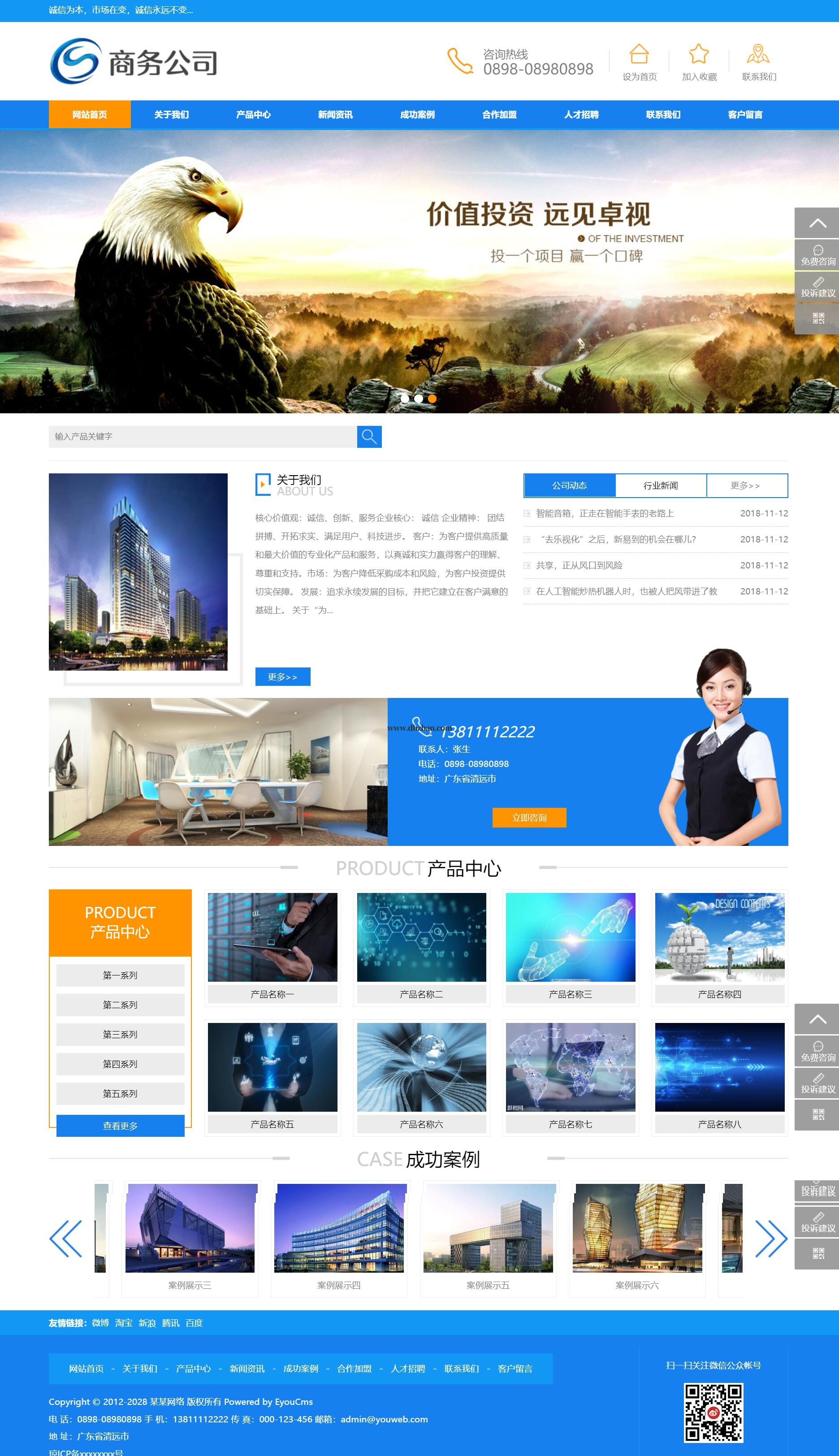 本模板自带eyoucms内核,无需再下载eyou系统,原创设计、手工书写DIV+CSS,完美兼容IE7+、Firefox、Chrome、360浏览器等;主流浏览器;结构容易优化;多终端均可正常预览。